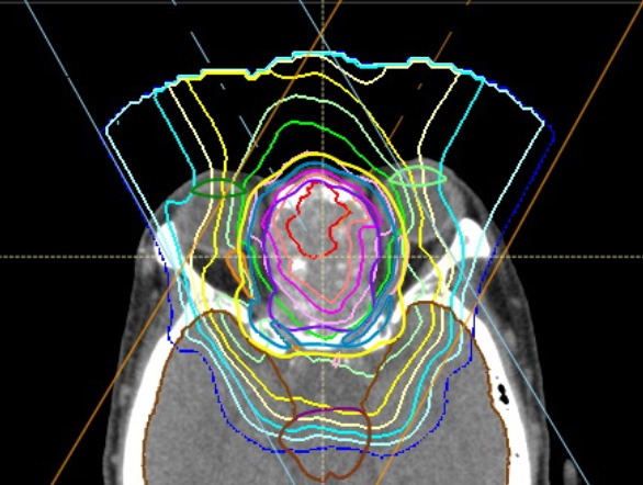 下に篩骨洞がんに対するスキャニング照射の線量分布を示します。眼球・視神経・脳といった重要臓器に囲まれた非常に治療の難しい部位ですが、腫瘍の形に沿った無駄のない照射となっています