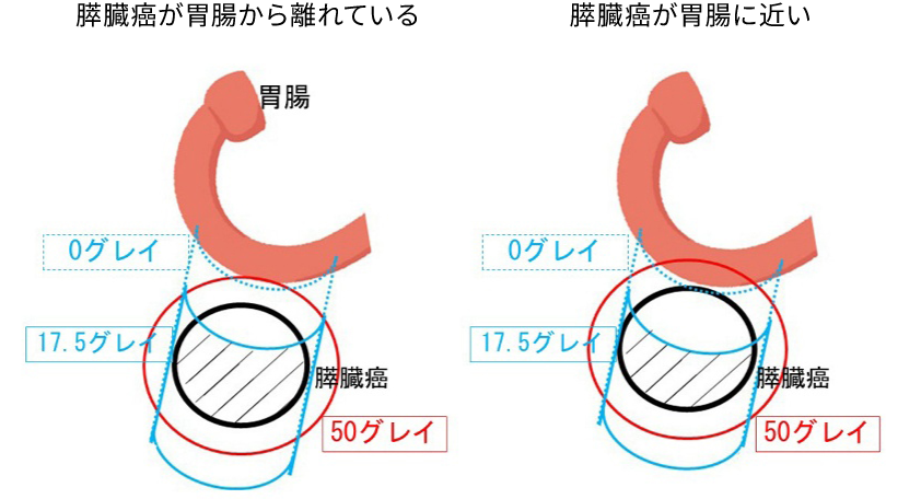 また、膵臓がんの病変が胃腸に囲まれていてリスクが高い場合は無理せず50 Gy(RBE)で終了にする場合もあります。また、可能な範囲で抗がん剤を併用します。