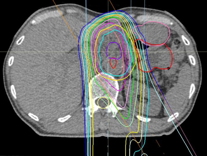 実際の線量分布の例を下に示します。水色の線が病変の範囲、内側のオレンジの線が67.5 Gy(RBE)の95%(64.1 Gy(RBE))が照射されている範囲。右方の赤やピンクの線が胃腸です。