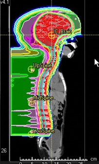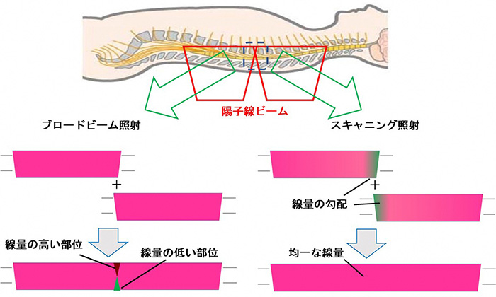 CSIは照射範囲が広いため、複数の照射範囲をつなぐことになります。ビームは扇状に広がっていきますので、照射範囲をつなぐ部位では、照射口に近い側は少し隙間ができて、遠い側は重なりができます。従来のブロードビーム照射は照射範囲に一定の強さの陽子線を照射しますので、照射口に近い側はどうしても少し低線量になり、遠い側は高線量になります。これをできるだけ過不足が少なくなるようにミリ単位で微調整を繰り返して治療計画を作ります。スキャニング照射では、1点ずつエネルギーを変えて照射できますので、コンピューターを使って適切なエネルギーの勾配をつけることで、最終的に均一な線量にすることが可能となります。この技術により、脳脊髄に均一に照射することができます。