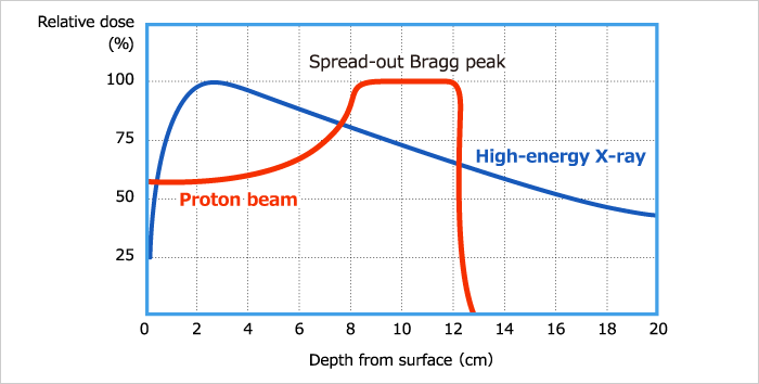 By making use of this property (the Bragg peak), characteristics such as the dose level can be adjusted so as to release concentrated high energy to cancer cells while reducing the energy released to surrounding healthy cells.